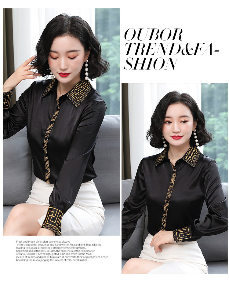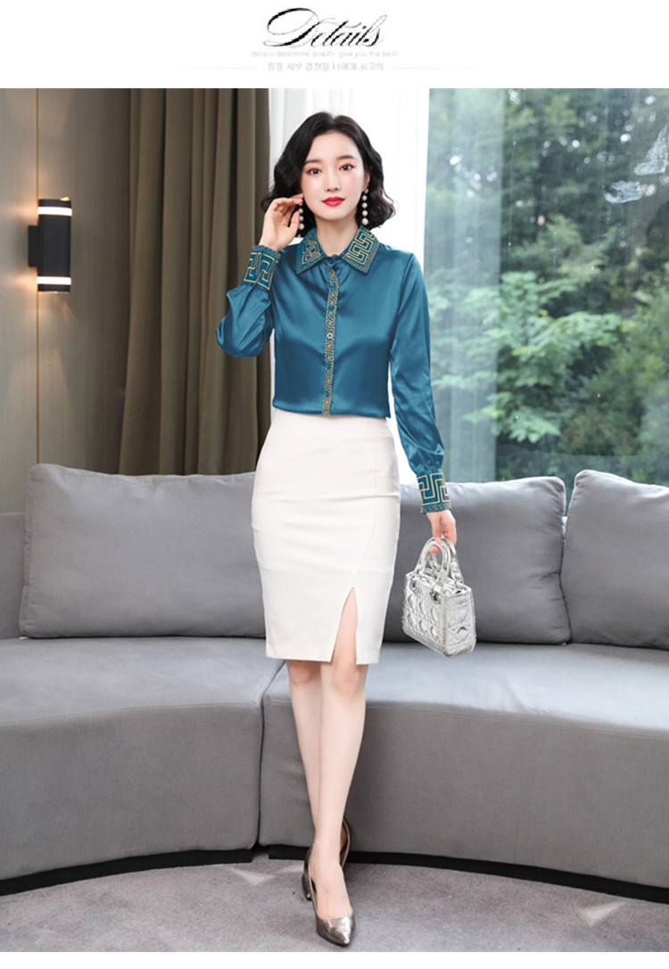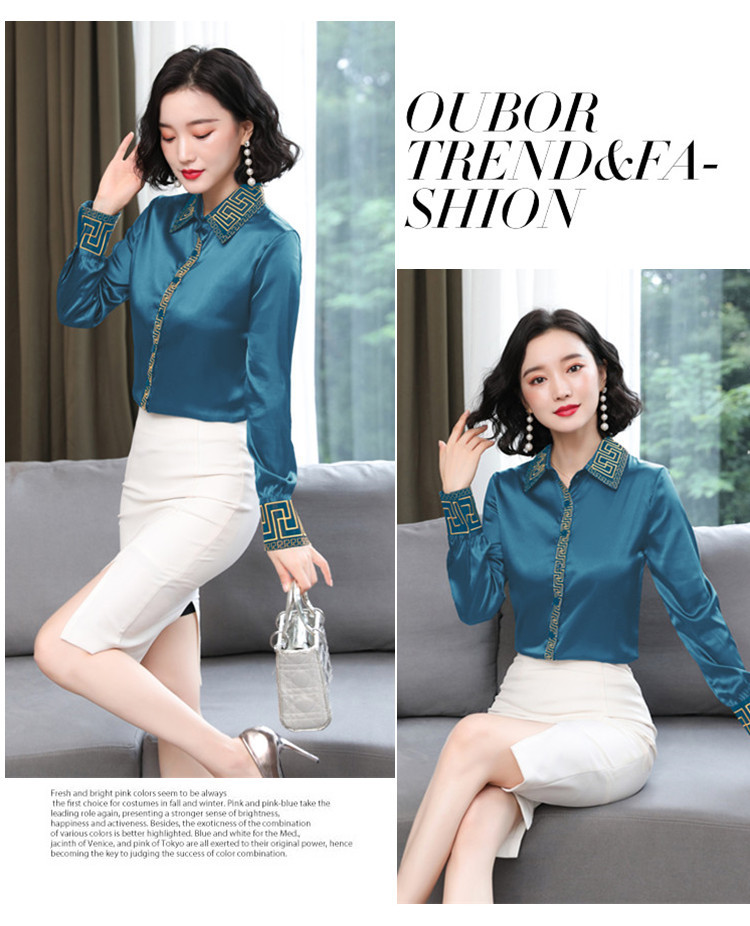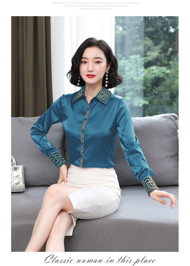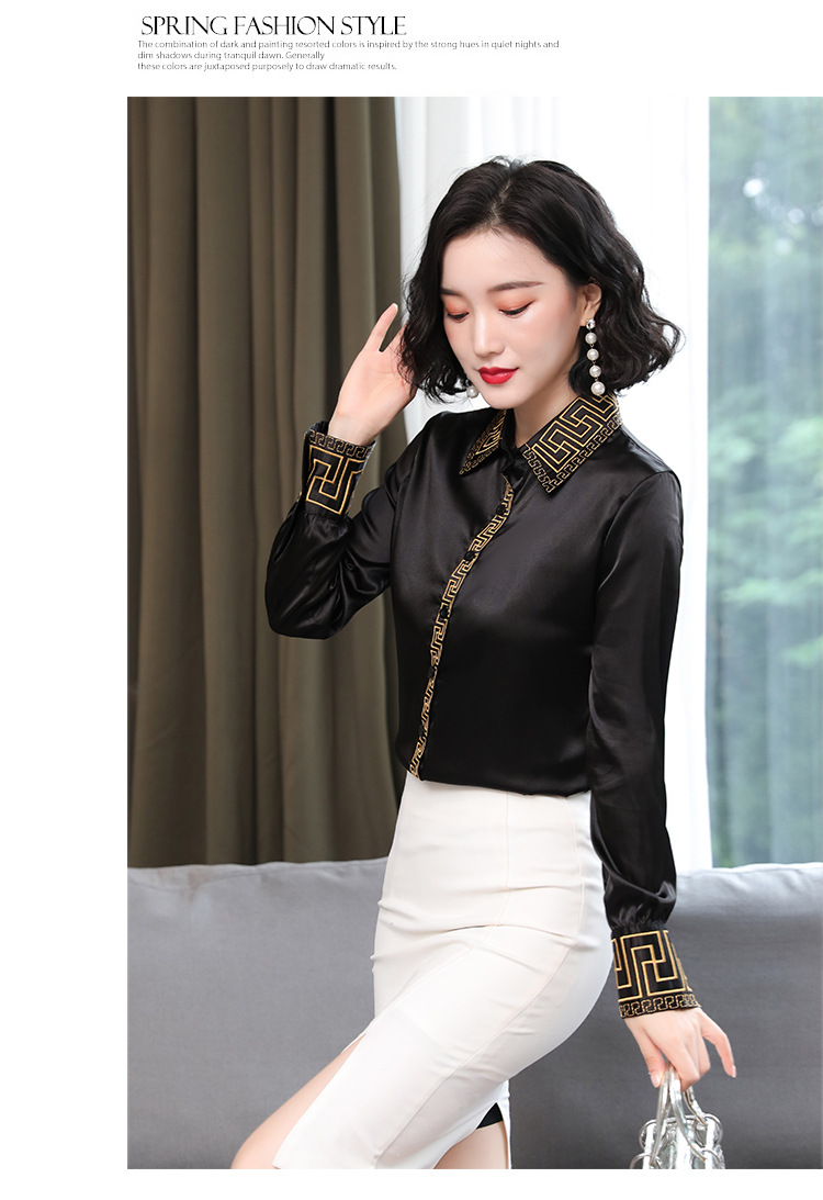 Women's Long-sleeve Satin Silk Top With Embroidered Shirt