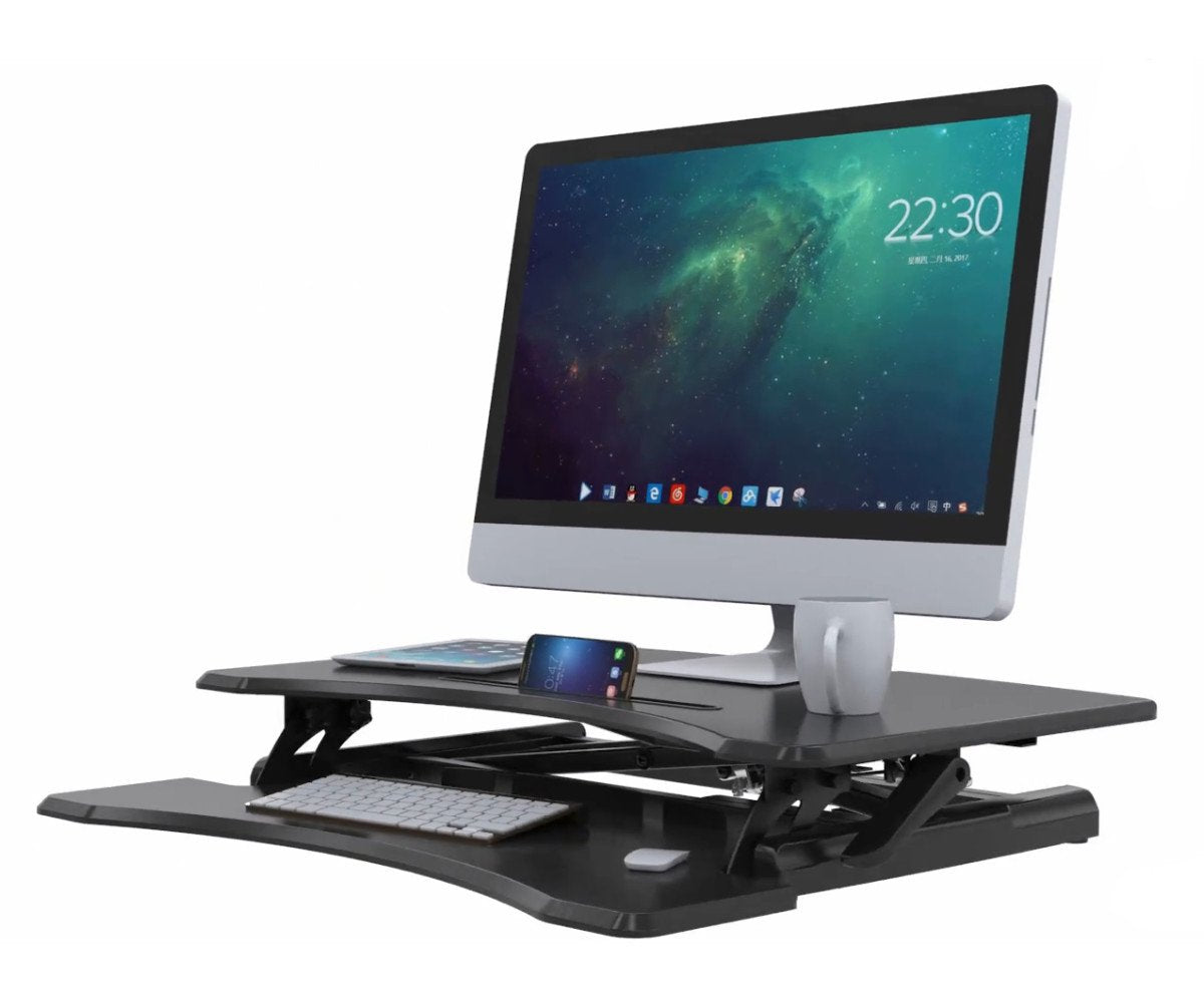 Do your BEST WORK while improving your health with the sturdiest, best value Sit-Stand desk solution. Get all the benefits of standing up at the office (including less back pain, increased energy, burning more calories) while still keeping your current desk. Easily switch from sitting to standing at the touch of a lever with the Lift Bridge desk by Home Concept. This height adjustable dual-tiered desk converter sits atop your current desk and gives you all the benefits of standing at work. The Lift Bridge desk can be the centerpiece of your new ergonomic-friendly work life. When you stand at your desk during your work day, you earn several health benefits such as more energy, increased blood flow and back pain relief. Standing helps your mind stay alert and productive while you work. The top platform rests 4.2" from your desk’s surface in lowest position and adjusts between up to 19.3”, which will accommodate users up to 6' 11" tall. Most of the desk comes assembled out of the box. Simply attach the keyboard and your desk is ready to go! Office ergonomics has been a hot topic of late because we all want to be healthier at work. Standing desks have become the focal point of ergonomics and efficiencies in the workplace. Getting correct and optimal desk height for computer work – or any work for that matter – has improved overall health of desk converter users across America.