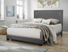 This bed provides a commanding presence in any room. This contemporary panel bed features a fully padded rectangular headboard with low profile footboard in a luxurious gray fabric. The headboard is accented with geometrically patterned nailhead trim in a chrome finish. The beds clean line design will go with various styles of case good finishes and will become the focal point in any bedroom
