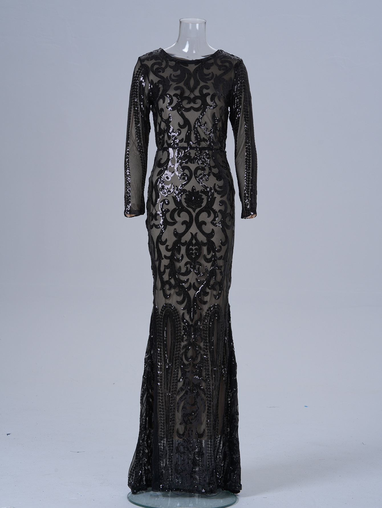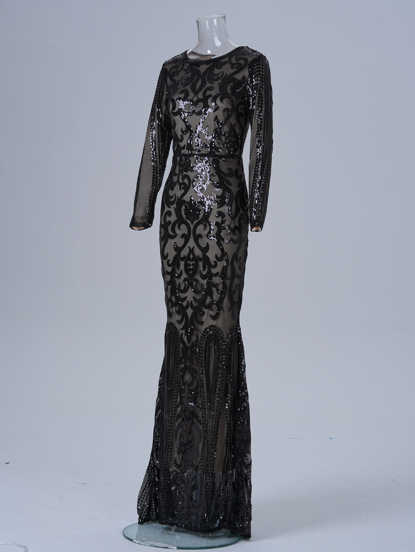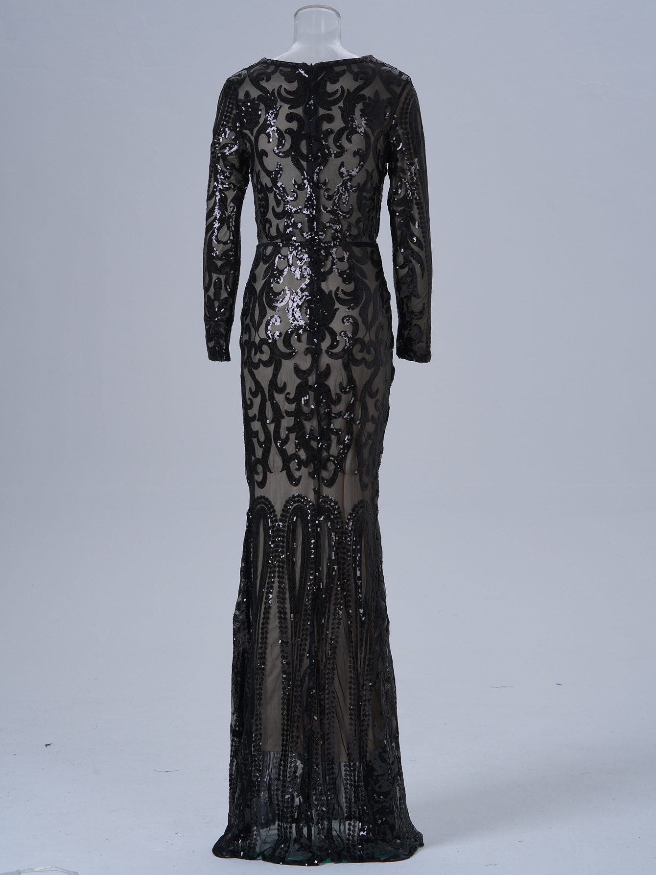 High-end Long Sleeve Temperament Crew Neck Sexy Long Sequined Banquet Evening Dress party