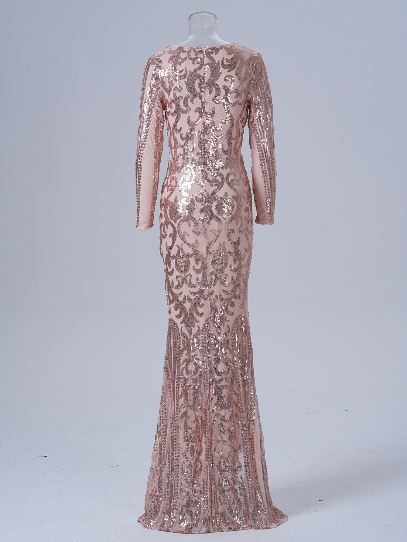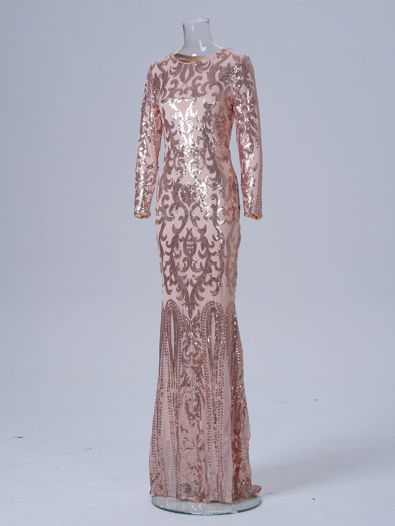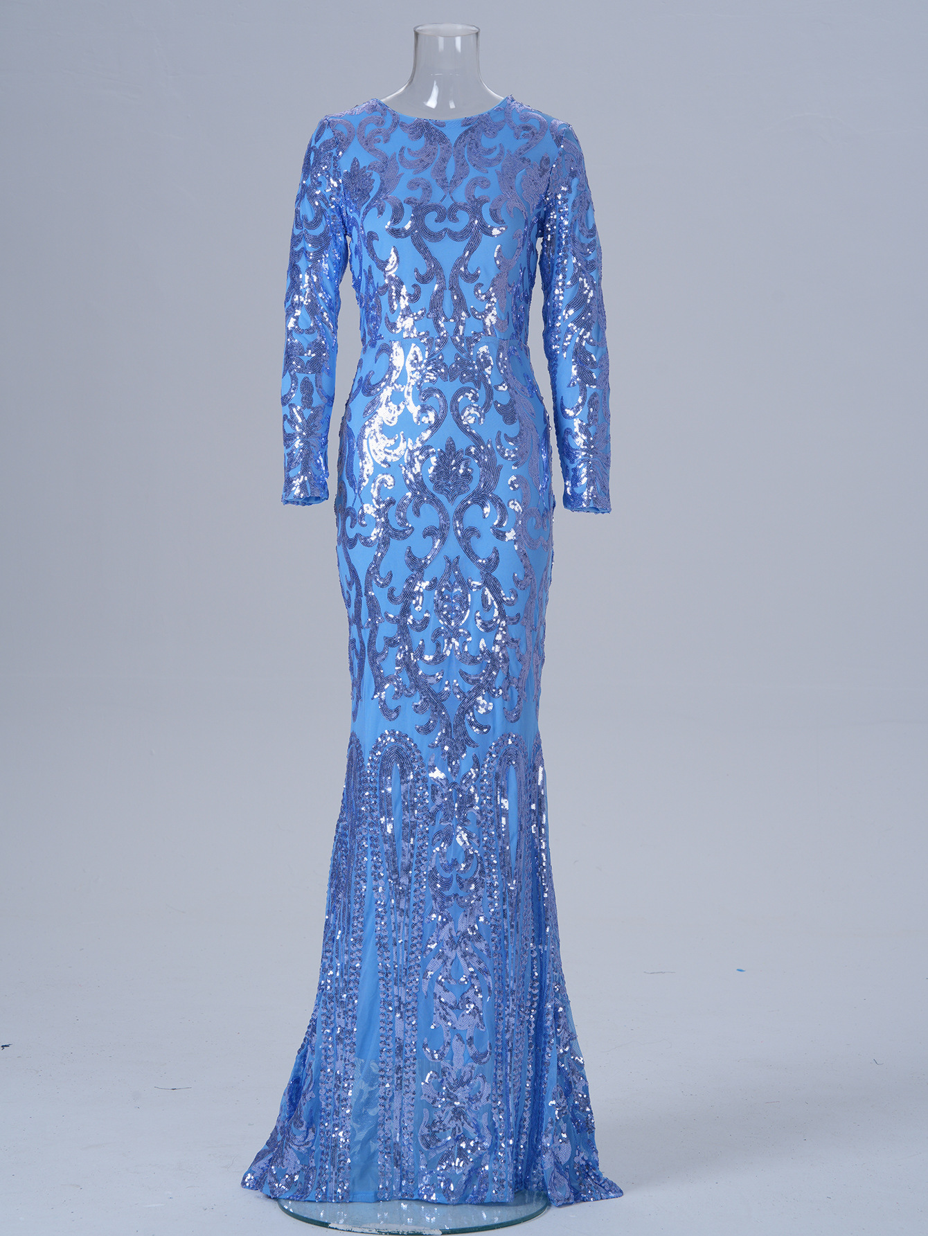 High-end Long Sleeve Temperament Crew Neck Sexy Long Sequined Banquet Evening Dress party