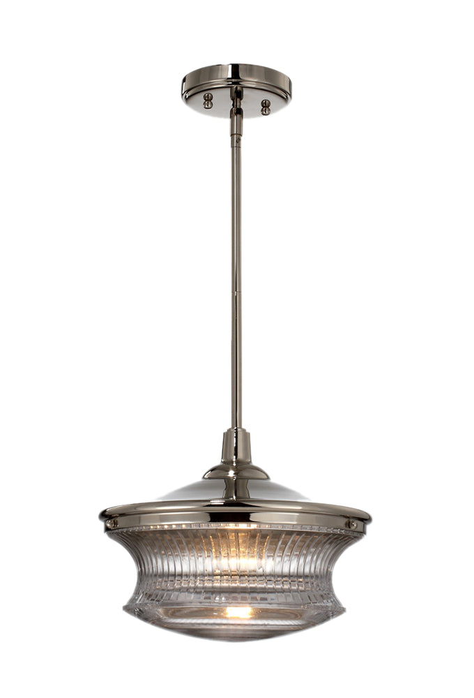 This timeless classic has been updated with a luxurious, hand-cut, glass schoolhouse globe. Use as a single pendant or hang in a group, this design comes in polished chrome or classic black finish. Additional Rods: 1=3", 1=6", 3=12".
