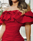 Women Black Off Shoulder Ruched Layered Ruffles Bodycon Dress